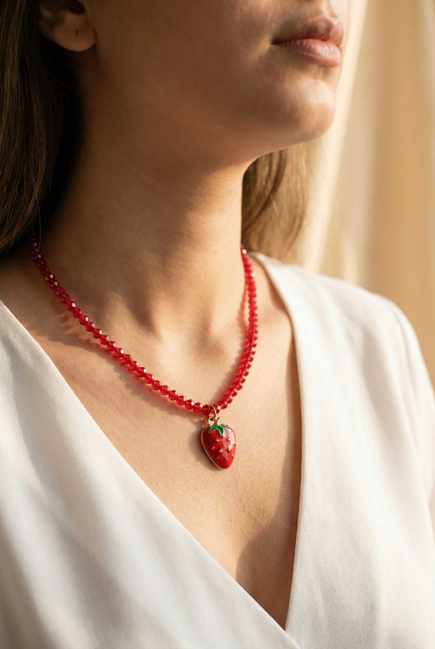 گردنبند مهرهای ۴۵ سانتی با آویز توت فرنگی — فانتزی دخترانه