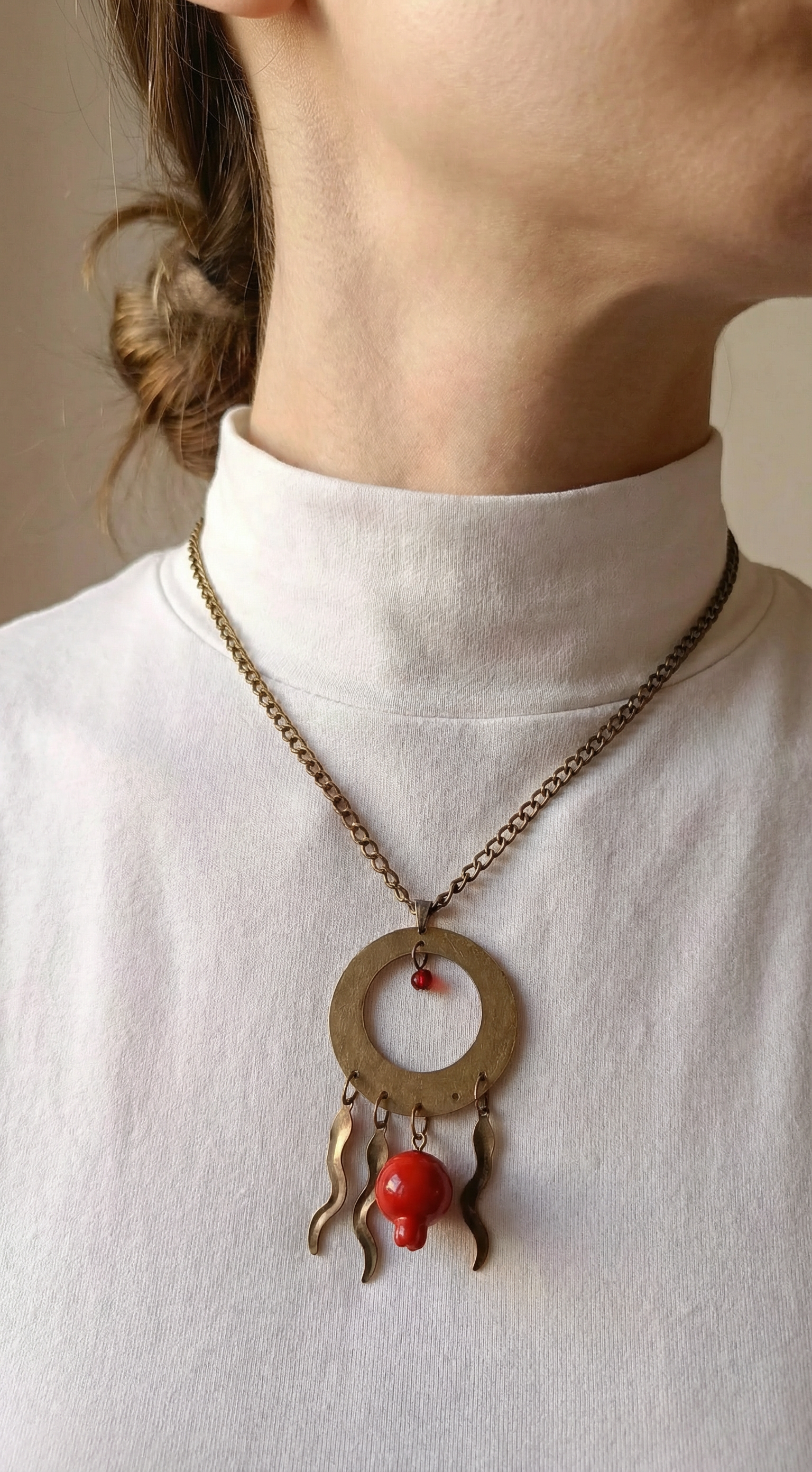گردنبند دستساز آنتیک با پلاک دایرهای و آویز انار قرمز – زنجیر ۵۰ سانت