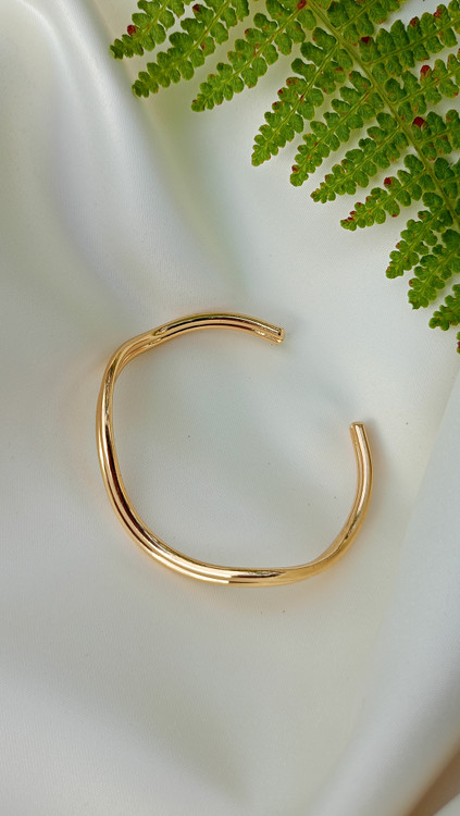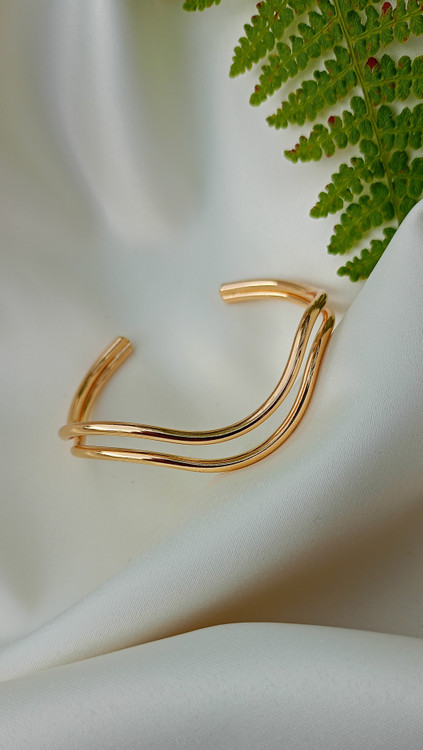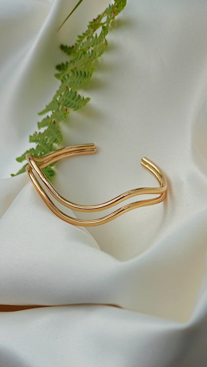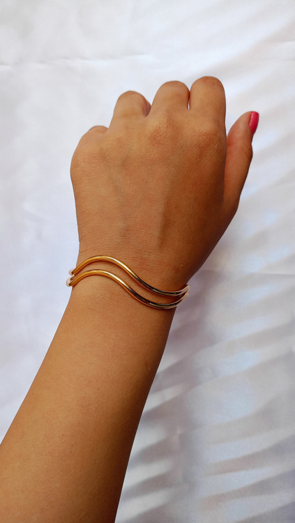 بنگل دو لایه مینیمال رنگ طلایی یک گزینه سبک، شیک و فوقالعاده کاربردی برای استایلهای روزمره و حتی استایلهای رسمیتره. طراحی موجی و دو ردیفهی این مدل باعث میشه روی دست جذابیت بیشتری داشته باشه و نسبت به بنگلهای ساده، جلوهی شیکتر و مدرنتری بده.