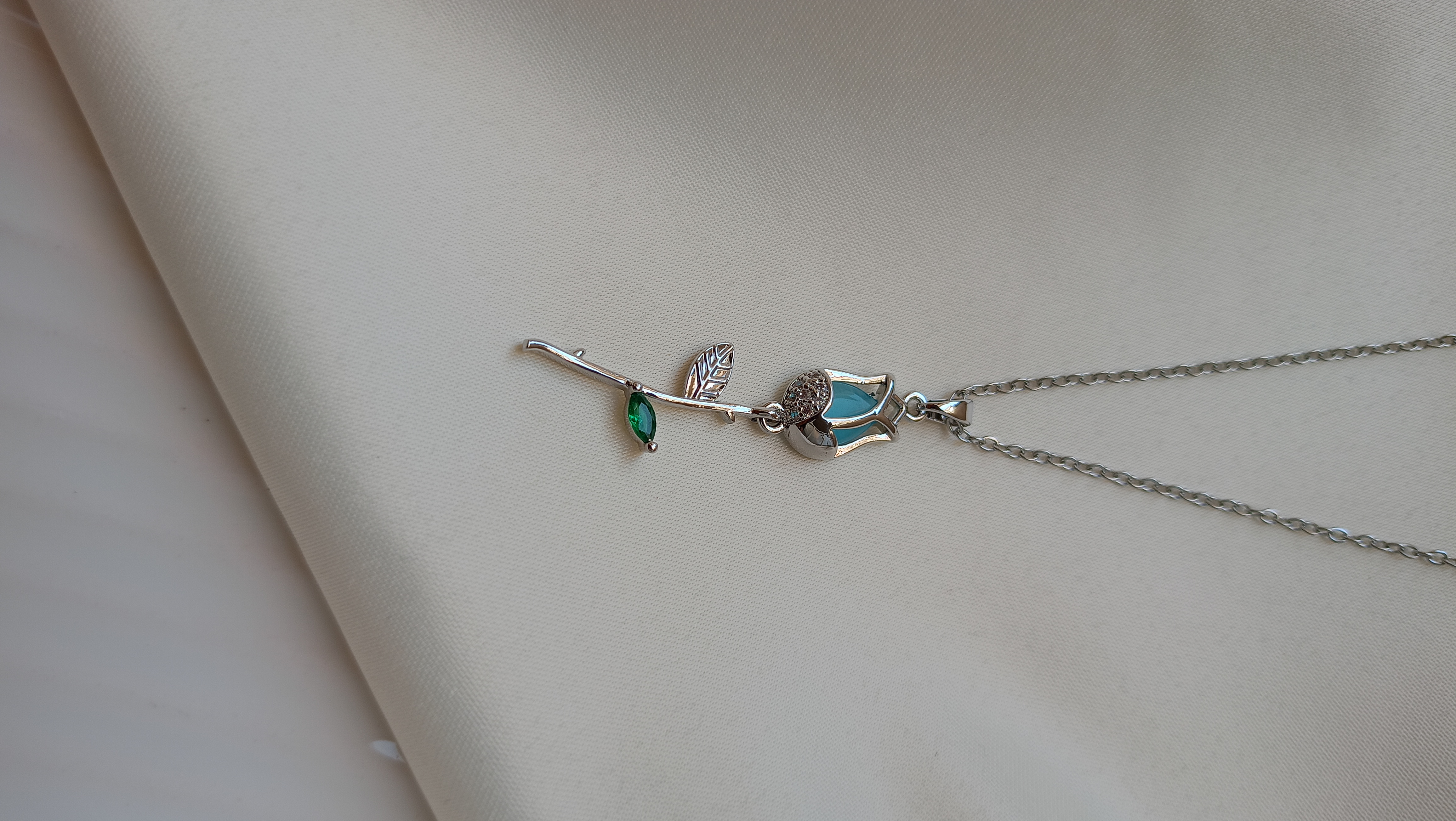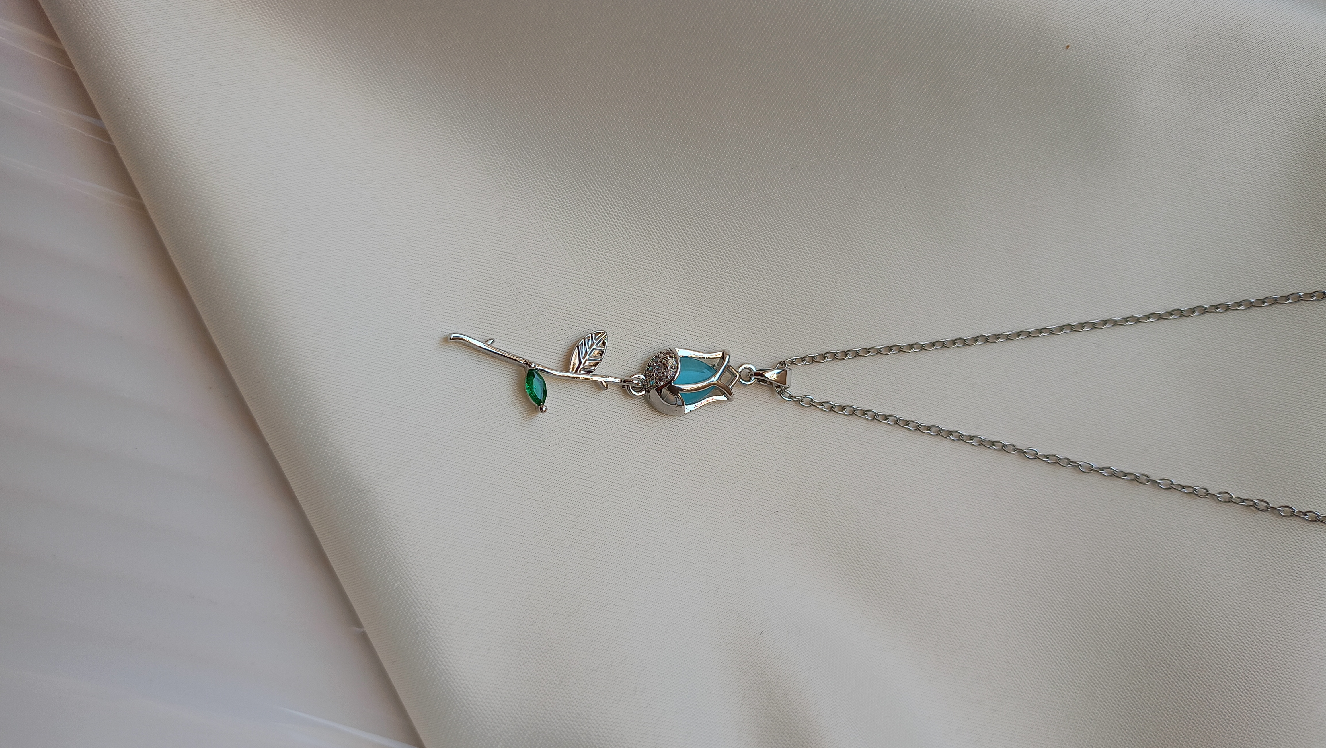 این گردنبند طرح گل رز، یک انتخاب ظریف و چشمنواز برای کساییه که عاشق اکسسوریهای خاص و دخترونه هستن. آویز رز با ترکیب رنگی آبی و سبز، جلوهای متفاوت به استایل میده و حتی با سادهترین لباسها هم خودش رو به چشم میکشه.