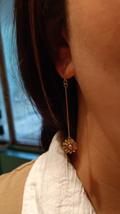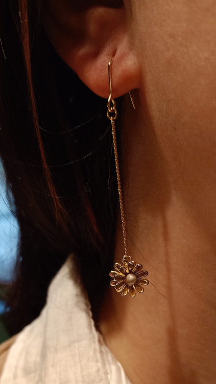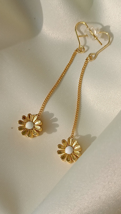 این مدل دارای یک زنجیر ظریف طلایی است که در انتهای آن یک گل بابونه زیبا با گلبرگهای طلایی و مرکز سفید رنگ قرار گرفته است. ترکیب رنگ طلایی و سفید، این گوشواره را به گزینهای عالی برای ست کردن با انواع لباسهای روشن و تابستانی تبدیل کرده است.