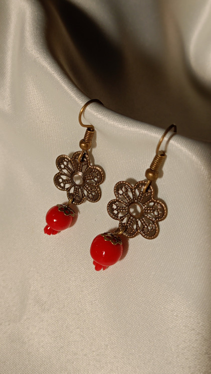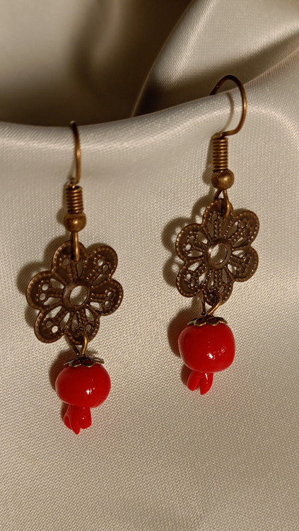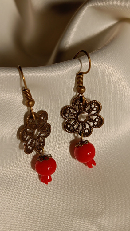 این گوشوارهی یلدایی با ترکیب آویز انار قرمز و قطعهی فلزی طرح گل، یک اکسسوری جمعوجور و چشمگیر برای شب یلداست. وزنش سبکه، توی گوش اذیت نمیکنه و رنگش براق و جذابه. برای استایل سنتی، تم یلدایی، یا حتی هدیه دادن گزینهی خوبیه. ظاهر کار سادهس اما دیده میشه و بهخاطر ترکیب رنگ قرمز و برنز، با اکثر لباسهای یلدایی ست میشه.
